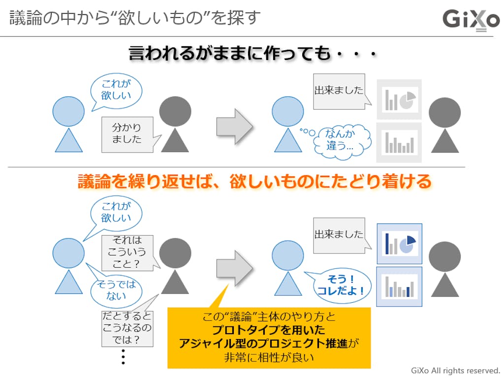 仕組みを使う立場である現場のメンバーから、「ギックス“が”いい」「ギックス“と”やりたい」というような声が上がっています。彼らは“議論”がしたいんですね。