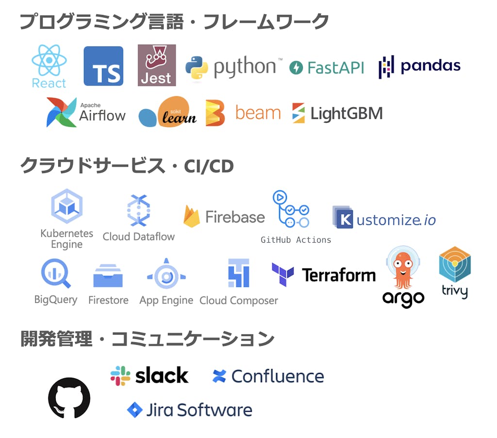 プロダクトによって採用する技術はもちろん変わってきますが、人数が少ない中で開発のレバレッジを効かせるため、GCP のマネージドサービスを積極的に利用することを一つの指針としています。言語はフロントエンドは React (Typescript)、バックエンドは主に Python を採用しており、インフラには Firebase や GKE を利用することが多いです。技術選定に際して目的に対してオーバースペックにならないことはもちろん前提としてありますが、トレンド技術には積極的にチャレンジしていくことを大事にしています。