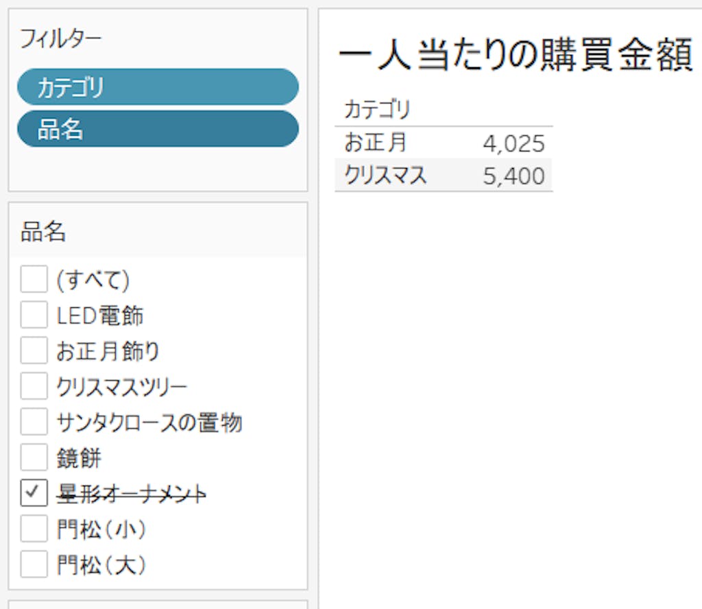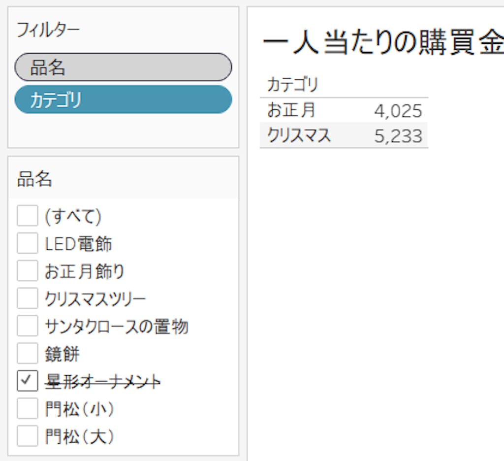 値が変わったのでフィルターが適用されたように見えます。しかし、察しの良い方はもうお分かりだと思いますが、この計算の最小粒度は会員番号×カテゴリなので、正しい値ではありません。一見正しく反映されているので見落としやすいのですが、ここがLOD表現を使う上での気を付けるべきポイントです。