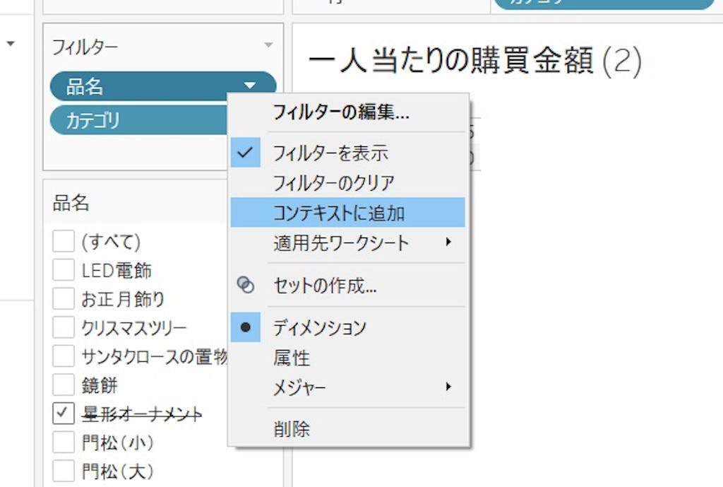 とはいえ、品名を先ほどのFIXEDの式に追加するやり方では、より細かい粒度で平均を計算しようとすることになるため不適切です。そんなときに便利なのが、フィルターをコンテキストフィルターにしてしまうという方法です。