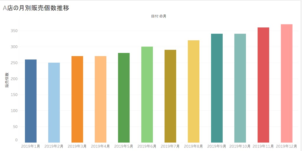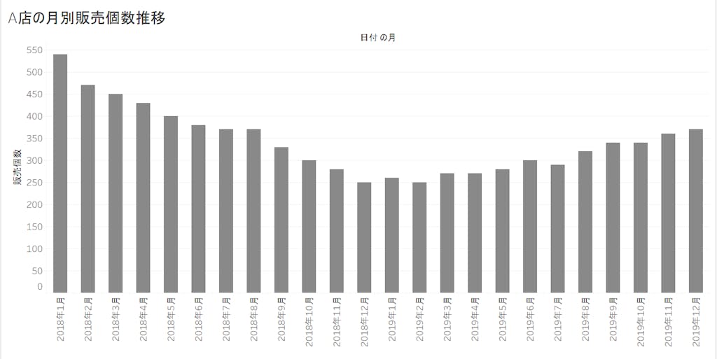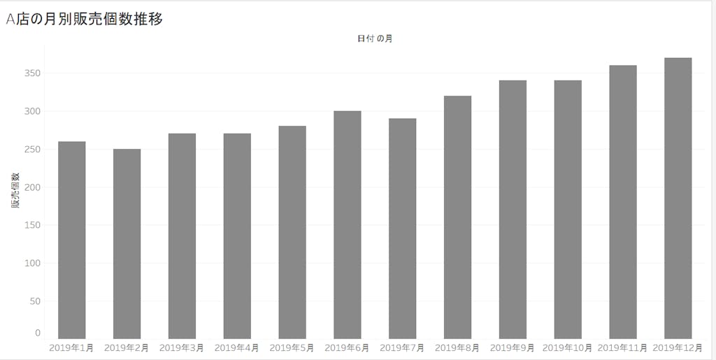 例えば、A店というお店の販売実績の分析で、過去1年間の販売個数の月次推移を集計したとします。可視化すると下の図のような感じですね。