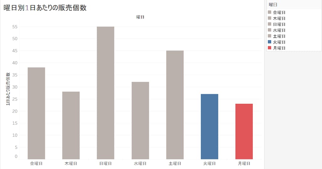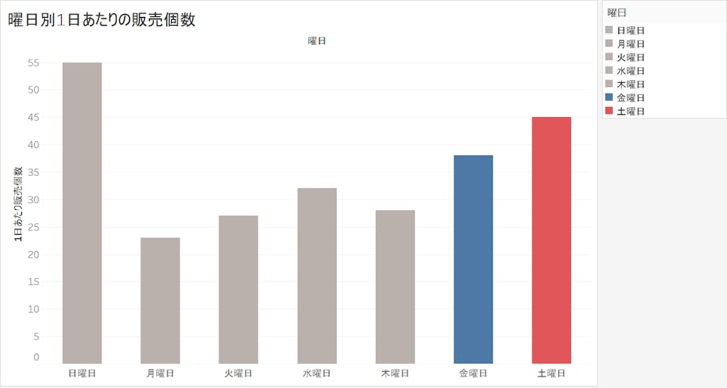 日本では、カレンダーで土曜日を青色にすることが多いです。なので、青色=土曜日と反射的に色で判断する人が多く、見慣れた色と異なる色を使ってしまうと見間違いを生んでしまいます。色だけでなく、並べる順番も大切です。下のような可視化は最悪ですね、、さすがに、こんな可視化を作成する人はいないでしょうが笑