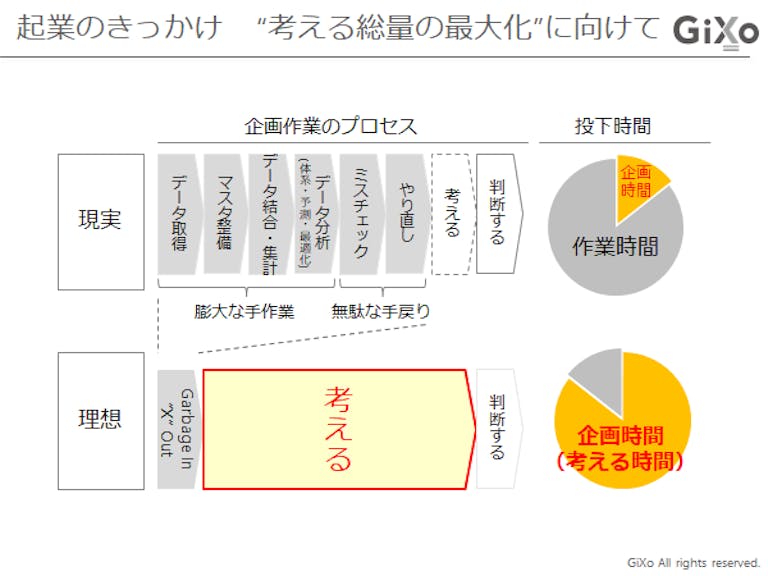 こうして、IBM時代の同僚である花谷、田中と共に3名で創業しました。3名とも戦略コンサルタントを経験していたため、「全件・全量・全粒度データを用いて網羅的で体系的な分析結果の読み解きや、高度な予測や最適化などを駆使することで、意思決定業務の高度化が行えるはずだ。」という仮説があり、企画部業務のupgradeをテーマにサービスを立ち上げていきました。