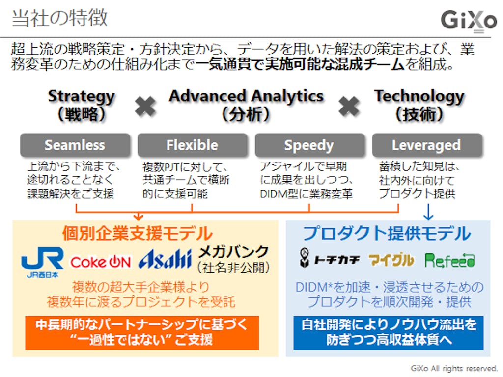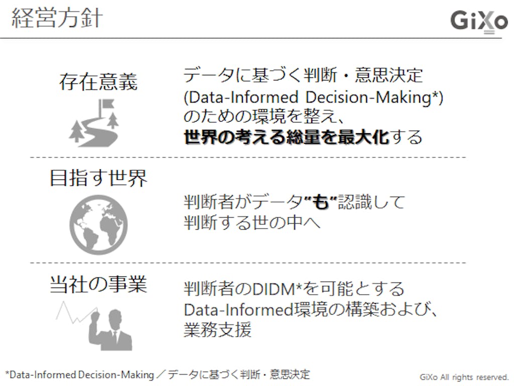 「データに基づく判断・意思決定(Data-Informed Decision-Making)の環境を整え、世界の考える総量を最大化」と言うPurpose(存在意義)のもと、ギックスは少しずつケイパビリティを補完しながら事業ドメインを広げています。