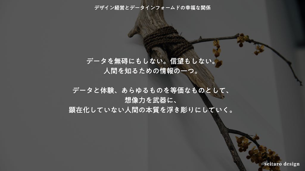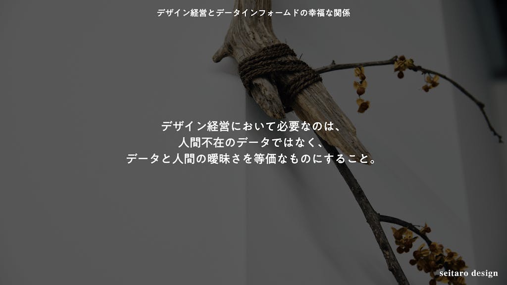 データもデザインもビジネスも、対立関係にあるわけじゃないと思うんです。みんな「人の心を動かす」という同じ山を登っているわけです。だから、データも体験も、理想も社会も、その他あらゆるものを等価なものとして取り扱って、物事を想像していく。そうやって、人間の顕在化していない本質を浮き彫りにしていくことが、デザイン経営とデータインフォームドとの一番良い付き合い方なんじゃないかなと僕は思うんですよね。