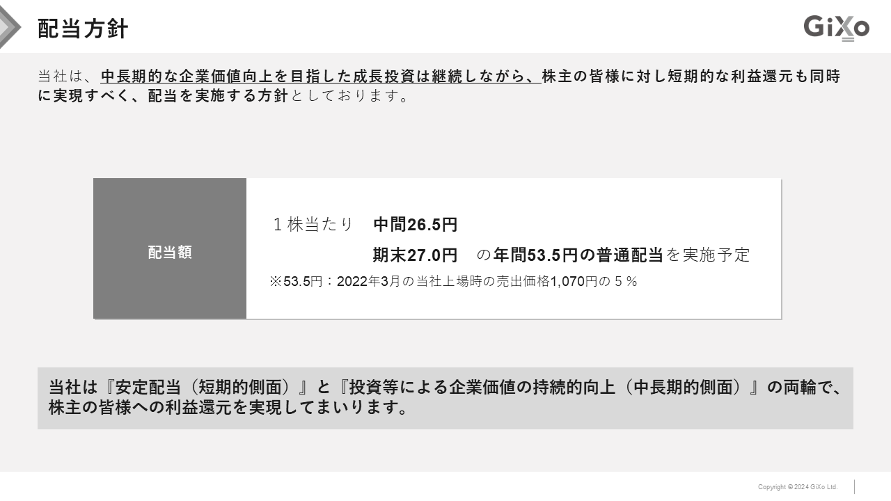 また、継続的に株式を保有いただくことが目的でもあるので、中間と期末、2回にわけて配当をすることにしました。金額はほぼ半分ずつとして、中間26.5円、期末27.0円です。