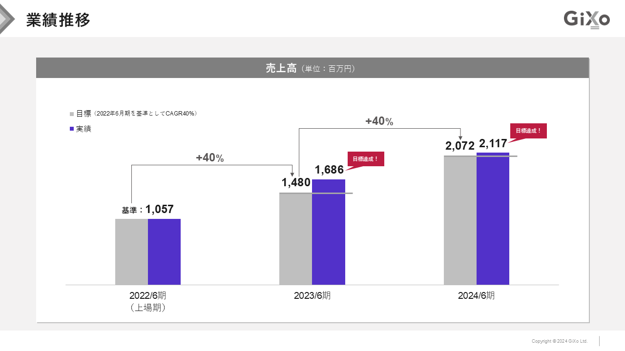 岩田 実際に、上場期の2022年6月期は10.5億円だった売上高が、2023年6月期には前年比59.5%の増収である16.8億円と、目標を大きく上回る結果となりました。一方で、その翌年の2024年6月期は売上高21.1億円となり、前年比で見ると25.6%の増収でした。しかし「上場期を基準として売上高成長率40%」の目標値となる20.7億円は達成しています。
