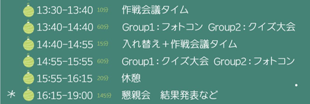 1チームをさらに2グループに分け、前後半を入れ替えながら「クイズ大会」と「フォトコンテスト」を同時に実施する、という進行でした。