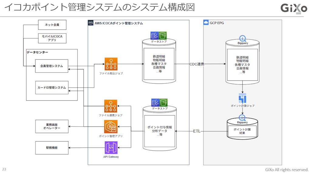 花谷:JR西日本様のICOCAポイント管理システムのモダナイゼーションの特徴として、データストア、実行基盤、APサーバ、アプリの各層で責務に応じた分離を行い、コスト低減を実現できる形でクラウドに移行した点があげられます。