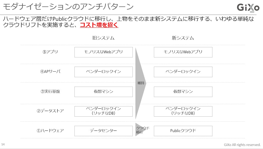 全部が全部“モダナイゼーションだ!”と一気にやるというのがバズワード的にブームになっていて、A社でははわずか1年で数千システムをパブリッククラウドにリフトした、といった事例もありますが、人の成長という面でも、システム面でも個人的にはリスクを感じる部分はあります。