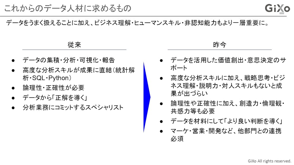 これまでのデータ人材は、データ収集・分析・可視化・報告、ということがメインの役割で、高度な分析スキルが成果に直結したり、論理性・正確性といったものが業務を進める上での肝になっていたと思います。データから正解を導くことが目的となっていて、データ分析業務にコミットするスペシャリストとしての存在でした。