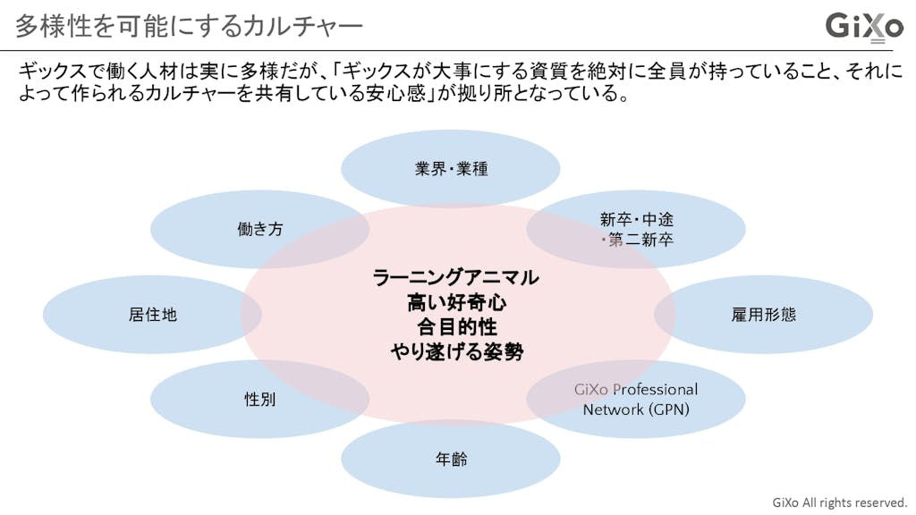では、なぜそこまでカルチャーにこだわるのか。それはひとえに、カルチャーの徹底によってギックスにおける人材の多様性を強みに変えられると考えているからです。