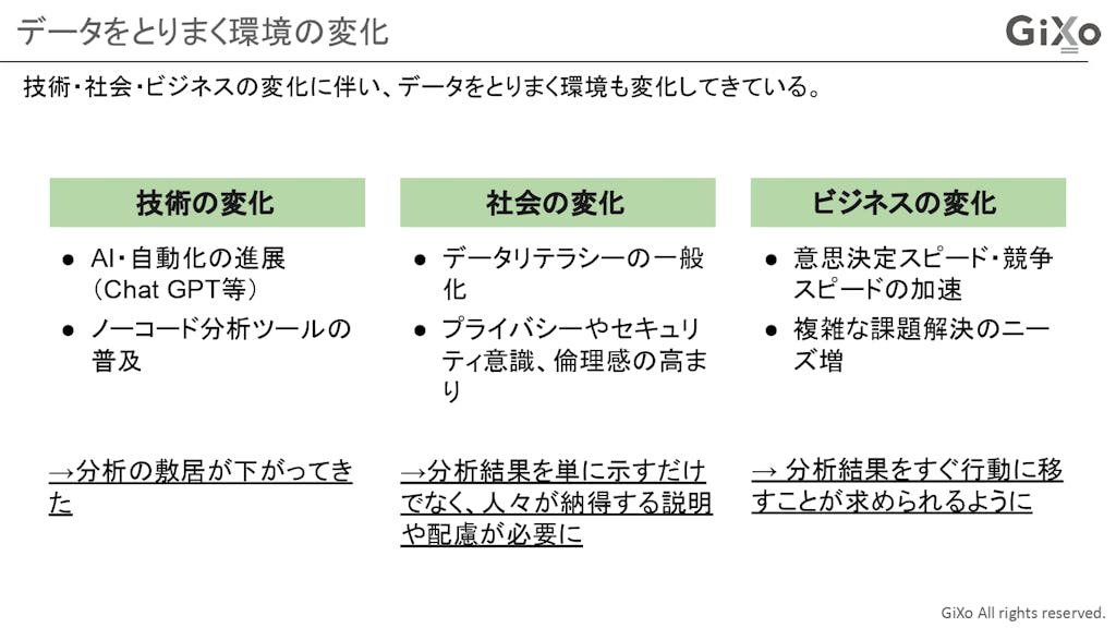 まず初めに技術の変化という観点では、AI・自動化の進展やノーコード分析ツールの普及などによって、データ分析の敷居自体が下がってきています。ChatGPTなどの生成AIはデータを司っている方に限らず、多くの方々が既にお使いかと思います。生成AIの誕生は、仕事の仕方や物事のアウトプットそのものが根底から覆るような感覚を、私自身も感じております。