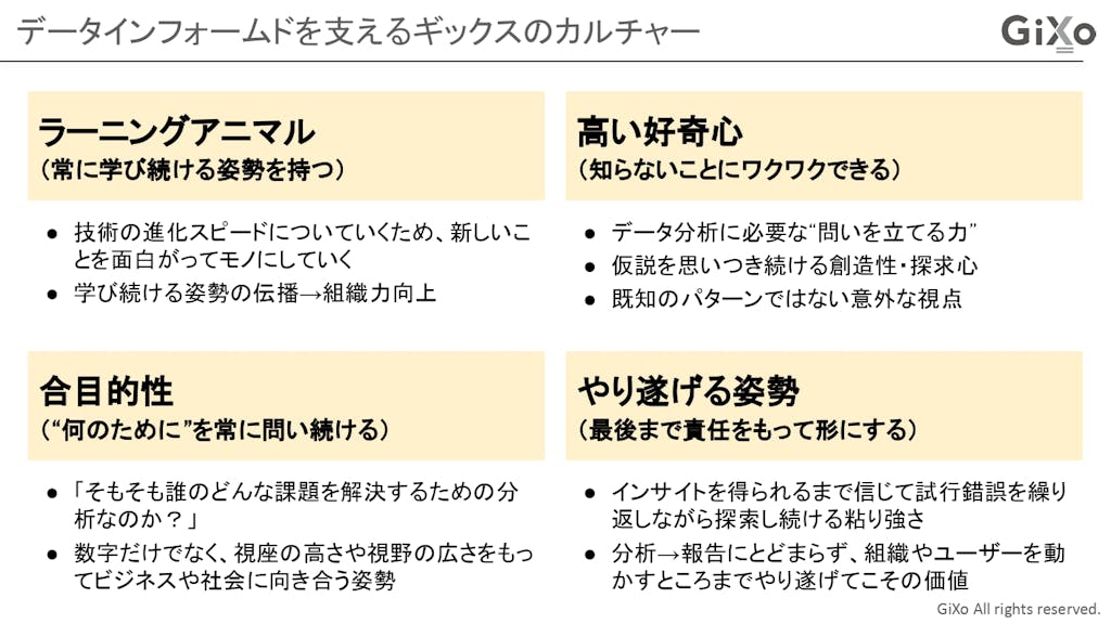 以上の話を踏まえた上で、ギックスの4つの“カルチャー”について紹介いたします。これは全職種の全社員に求める資質になりますが、本日はデータ分析・データ人材という切り口で少しだけ深掘りしてみたいと思います。