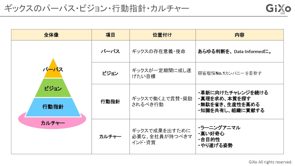 ギックスでは、「あらゆる判断を、Data-Informedに。」というパーパスを頂点として、これを実現するためのビジョン・行動指針・カルチャーを定めています。