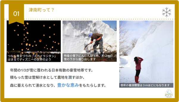我々はこの大雪をプラスに変えていきたいと考え、最近は「ゆき みず だいち つなんまち」というブランドスローガンを発信しております。