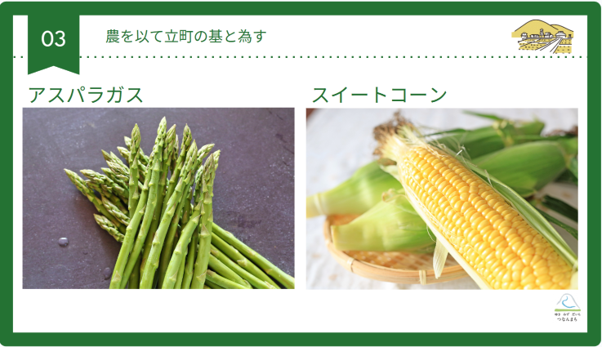 アスパラガスとスイートコーン、雪下人参なども生産しています。アスパラガスは実は生産量は少ないのですが、非常に高いレベルの美味しさだと思っていまして、ぜひこれから売り出していきたいです。