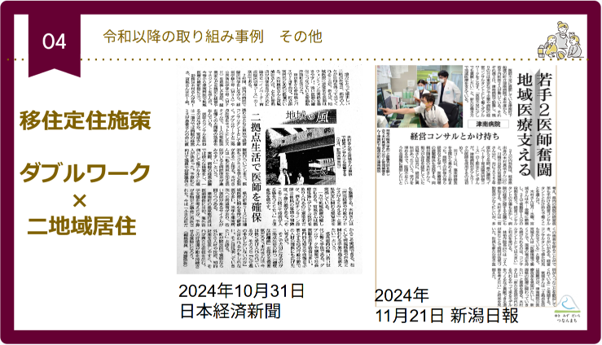最近は医師による2地域居住とダブルワークの合わせ技のような取り組みについて、日本経済新聞にも取り上げていただきました。東京など都市部在住の医師に週の半分は津南に通ってもらい「2人で1人分の常勤医」となっていただくことで、町の医療を守ってもらっています。