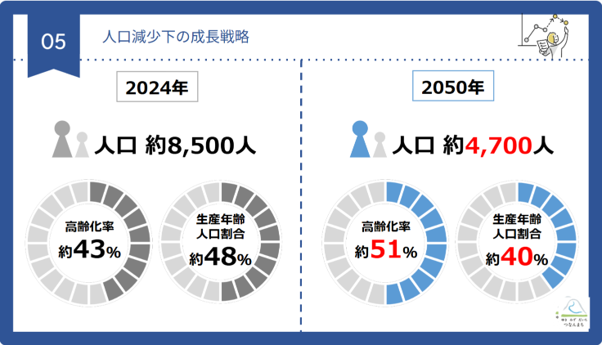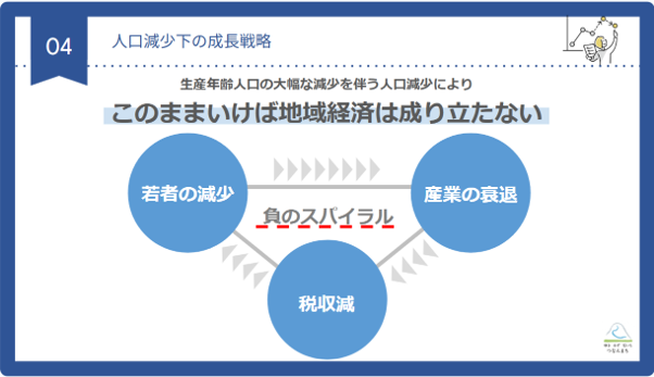 人口減少下では、このままいけば負のスパイラルに陥り地域経済が成り立たなくなります。そうなりますと、ある意味強制的かつ不本意に住民サービスを止めざるを得なくなり、公共施設も閉じる必要が出てきて、結果的に町民のQOLが下がってしまいます。つまり、このまま何も行わなければ経済文化的に消滅することを意味します。