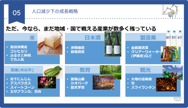 しかし津南町には、地域で有数、国で有数という高いレベルで戦える産業はまだ残っていますので、この部分に力をいれていこうという戦略をとっています。