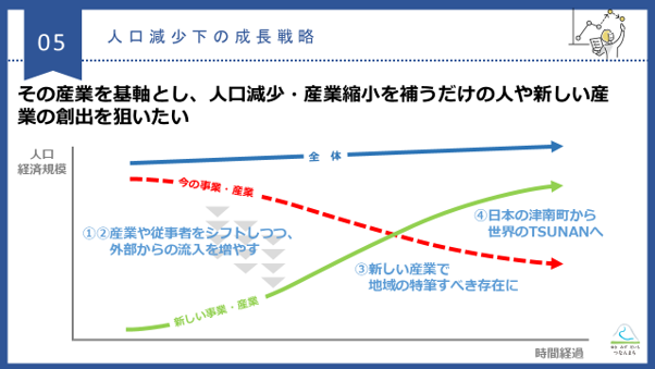 このスライドはあくまでイメージですが、赤い点線の矢印は、人口減少にあわせて今の事業を整理し、ある意味ダウンサイジングをしていくような考え方を示しています。一方で緑の矢印は、これから起爆剤になるような取り組みを表しており、津南町ではこの両軸での施策を行っています。