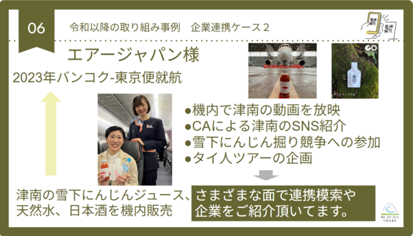 以上のような取り組みを今日まで進めてきています。最近、エアージャパンに乗ってシンガポールから来られて、機内で動画を見たことをきっかけに津南町にお越しいただいた、という方にお会いしまして、本当に嬉しかったです。取り組みをしていてよかったと心から思いました。