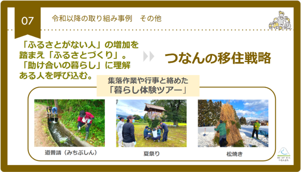 最近は、ふるさとがない子どもたちが増えてきているということで、「ふるさと作り」が非常に大事になると考えています。そこで、地域を知っていただくための体験ツアーを実施しています。数回の訪問を通して徐々に階段を上がるように関係人口になっていただき、なかには移住される方も生まれています。