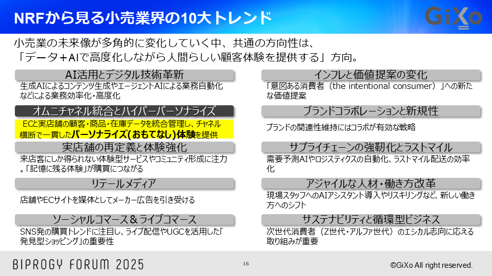 さて、小売の話に入ります。近年のNRF(NRF Retail’s Big Show:世界最大級の小売業界展示会)はテクノロジー展示会のような雰囲気があり、AI等も取り上げられていましたが、その中で今年はテクノロジーの進歩と同時に「人間らしさの回帰」や「情緒的な顧客体験」の重要性が語られていました。