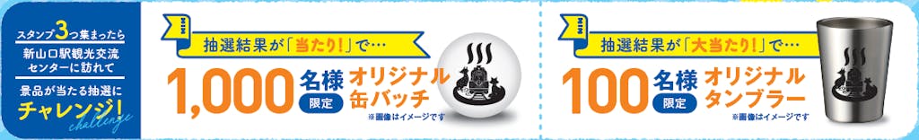 ③ デジタルスタンプを3つ集めてスタンプラリーを達成すると、抽選で100名様に「オリジナルタンブラー」、1,000名様に「オリジナル缶バッチ」をプレゼント(景品は新山口駅観光交流センターで交換)