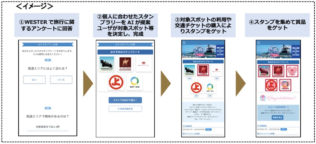 ・移動生活ナビアプリ「WESTER」のおトクにGo!からエントリーし、簡単な3問のアンケートに答えるだけで、AIが個人に合わせたおすすめの観光スポットなどを提案します。提案内容を踏まえ、ユーザは好みに合わせてスタンプラリーをアレンジして設定します。