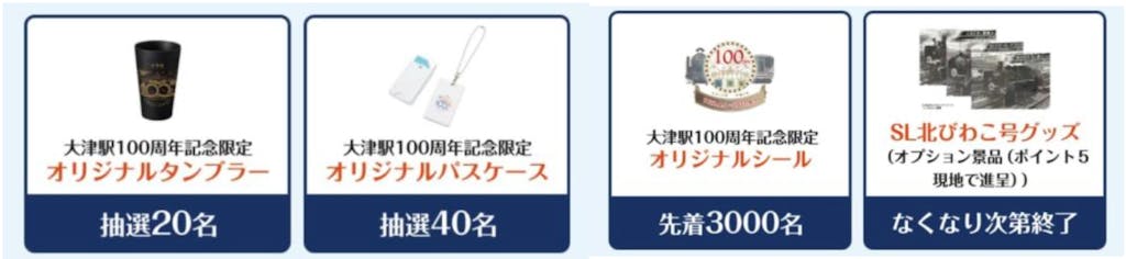 ④景品(シール・パスケース・タンブラー)の受け取りは大津駅みどりの窓口となります。