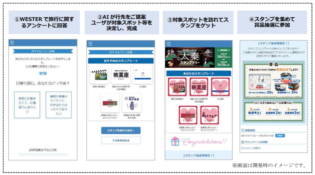 ・移動生活ナビアプリ「WESTER」のおトクにGO!からエントリーし、簡単な事前アンケートに答えるだけで、AIが参加者に合わせた旅の行先を示すスタンプシートを生成します。参加者は好みに合わせてスタンプシートをアレンジしながら観光を楽しめます。