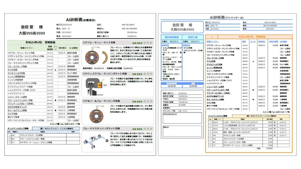 自動車ディーラー・自動車整備工場向けに提供する、AIによる車の部品交換・整備予測を支援するシステムです。車両情報をシステムに入力するだけで、AIが約80項目の整備内容を診断し整備の必要有無について推奨度を算出した「AI診断書」を作成します。