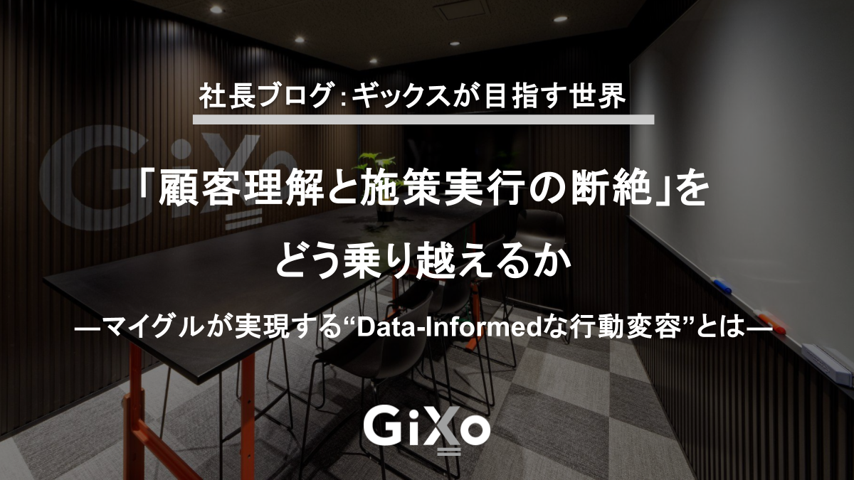 Corporate 2026.04.30 10:30 「顧客理解と施策実行の断絶」をどう乗り越えるか ―マイグルが実現する“Data-Informedな行動変容”とは―|社長ブログ:ギックスが目指す世界 こんにちは。ギックス代表の網野です。 データ分析を行っても、それが必ずしも施策にうまくつながらない。こうした場面に直面したことがある方も多いのではないでしょうか。私自身も、これまでのプロジェクトの中で同様の状況に何度も向き合ってきま...