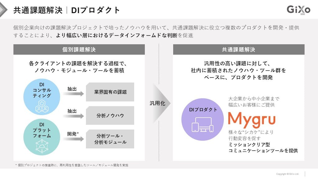 DIプロダクトでは、このノウハウとアセットを活用して、プロダクトを開発します。この開発手法は、開発効率の向上に寄与するのみならず、DIコンサルティング、DIプラットフォームの両サービスによって「顧客の課題解決・データインフォームドな判断のために、有用である」と証明された手法で、商品を開発できるというメリットを生んでいます。